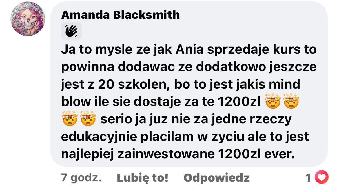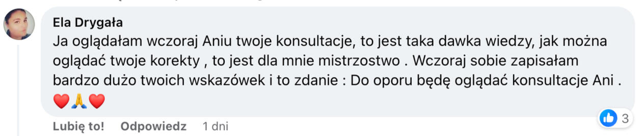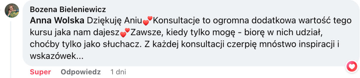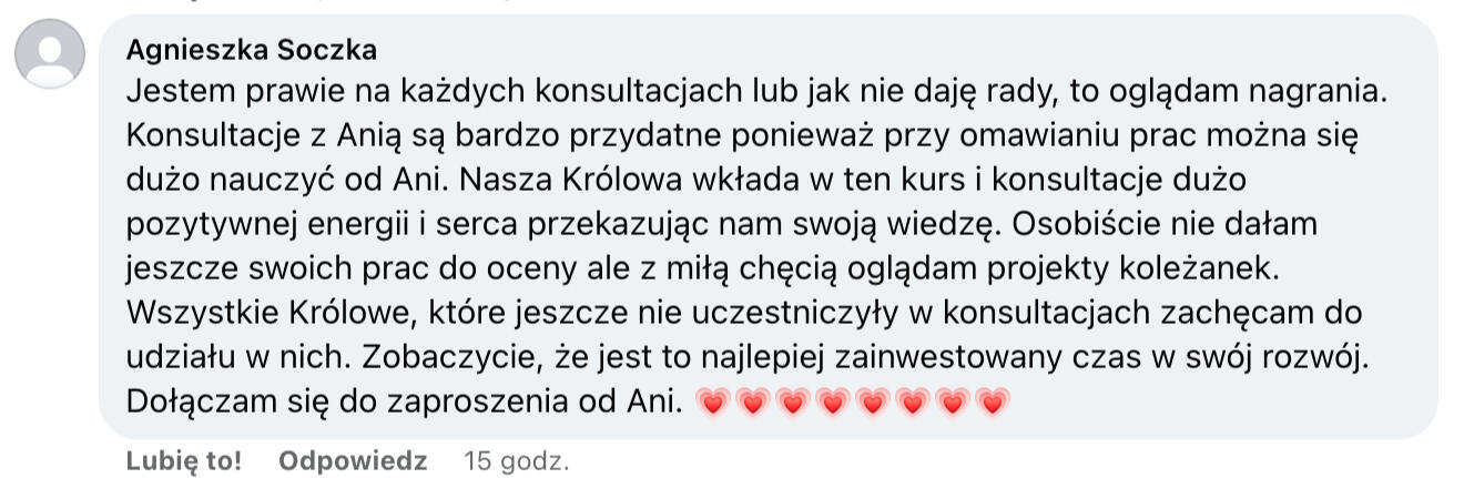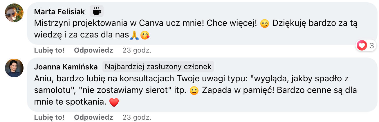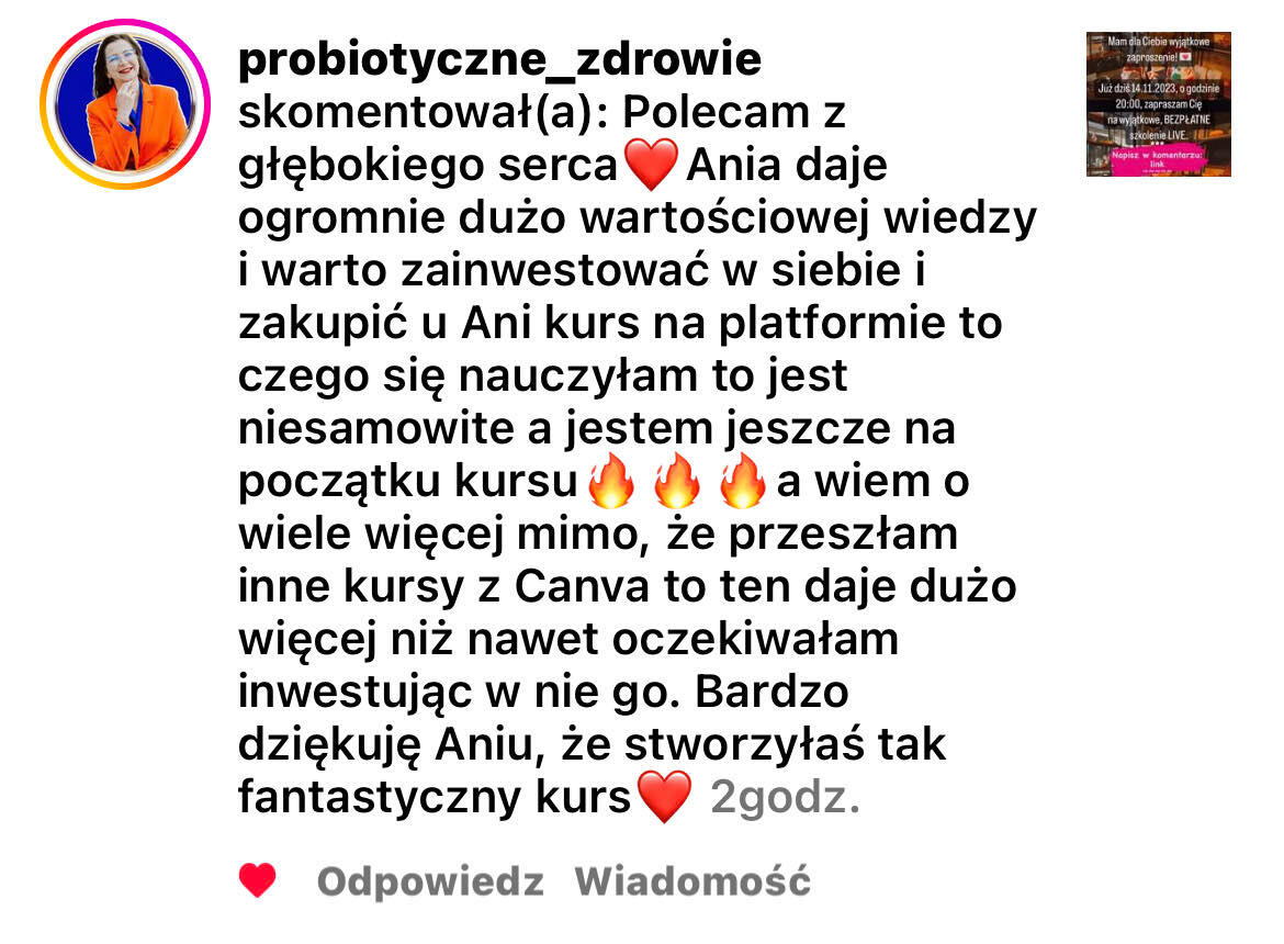 PS jestem w trakcie kursu i za każdym razem, kiedy siadam do lekcji, czy mam możliwości uczestniczenia w dodatkowych spotkaniach z Anią, jestem wdzięczna, że mogę uczyć się od najlepszej kreatorki Canva ❤️❤️❤️- Wiola