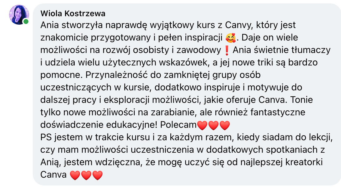 PS jestem w trakcie kursu i za każdym razem, kiedy siadam do lekcji, czy mam możliwości uczestniczenia w dodatkowych spotkaniach z Anią, jestem wdzięczna, że mogę uczyć się od najlepszej kreatorki Canva ❤️❤️❤️- Wiola